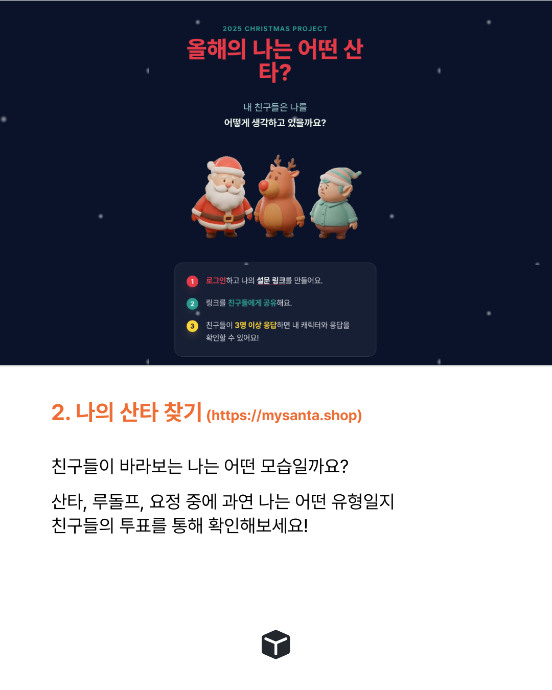 여러 유형의 산타 캐릭터 중에서 친구들이 “너한테 어울린다”고 생각하는 산타에 투표하고, 짧은 메시지를 함께 남길 수 있어요.